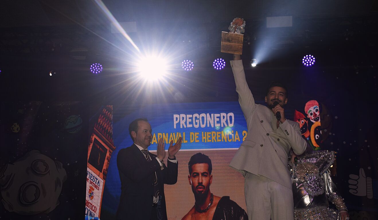 Durante su intervención, González ha hecho referencia a comparsas y grupos emblemáticos, se ha animado a sacar a bailar a varias personas del público y ha logrado poner en pie a todo el recinto interpretando uno de sus temas, culminando un pregón cercano, dinámico y muy aplaudido. Al término del mismo, recibió el Perlé del Carnaval de Herencia, como reconocimiento a su papel como pregonero de esta edición.