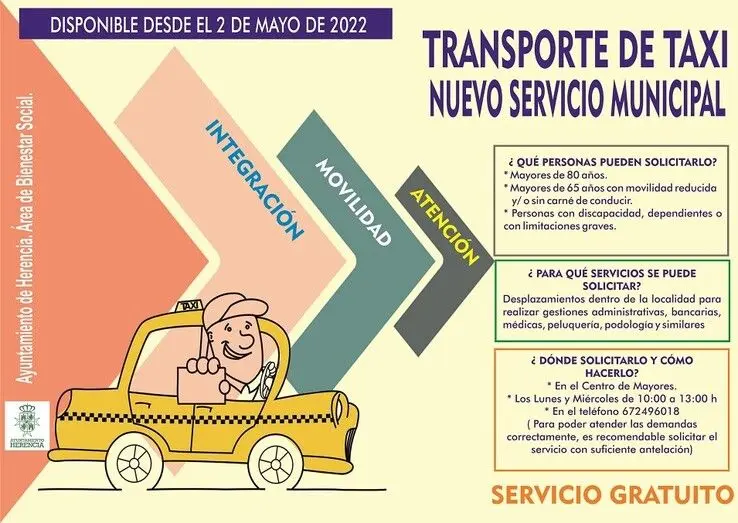 Tras su aprobación en Pleno, la Concejalía de Bienestar Social y el Centro de Mayores van a poner en marcha el Servicio Municipal de Transporte de Taxi gratuito para atender a personas en situación de vulnerabilidad que no cuenten con medios propios para desplazarse.