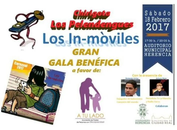 Fue tan buena la experiencia que este año han querido seguir organizando una nueva gala benéfica que se celebrará el próximo 18 de febrero en el Auditorio Municipal, en dos pases a las 17,30 y a las 20,00 horas, a solo 5 euros la entrada. Contarán con dos padrinos de excepción: ROLANDO URÍOS, ex jugador de balonmano y campeón del mundo, y ARTURO ROJO, periodista de TV La Mancha y Radio Surco. En esta ocasión quieren ayudar a Álvaro y su familia, junto con la organización a la que pertenece, la Asociación “A tu Lado” –Asociación de Padres de Personas con Discapacidad-. Este muchacho padece ACIDURIA GLUTÁRICA, una ‘enfermedad rara’ descrita por la FEDER (Federación Española de Enfermedades Raras). En estos últimos años han intentado probar tratamientos para mejorar la calidad de vida de Álvaro pero es complicado. Cuando le han hecho estudios cerebrales han utilizado para ver sus respuestas los discos de nuestra chirigota, pues es lo que le produce reacciones más claras, “y esto para nosotros es algo que nos despierta unos sentimientos inenarrables”.