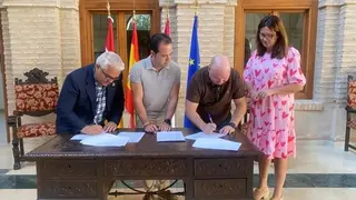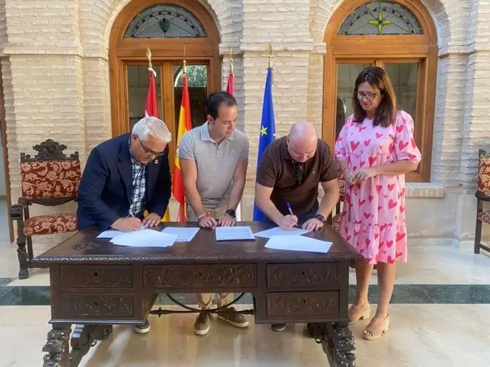 El presidente de Mancha Norte, Carlos Ortíz, junto con la vicepresidenta, Conchi Rodríguez Palancas y el alcalde de Herencia, Sergio García-Navas Corrales han realizado la firma de diferentes contratos con el grupo de desarrollo e innovación Mancha Norte en tres empresas de la localidad.
