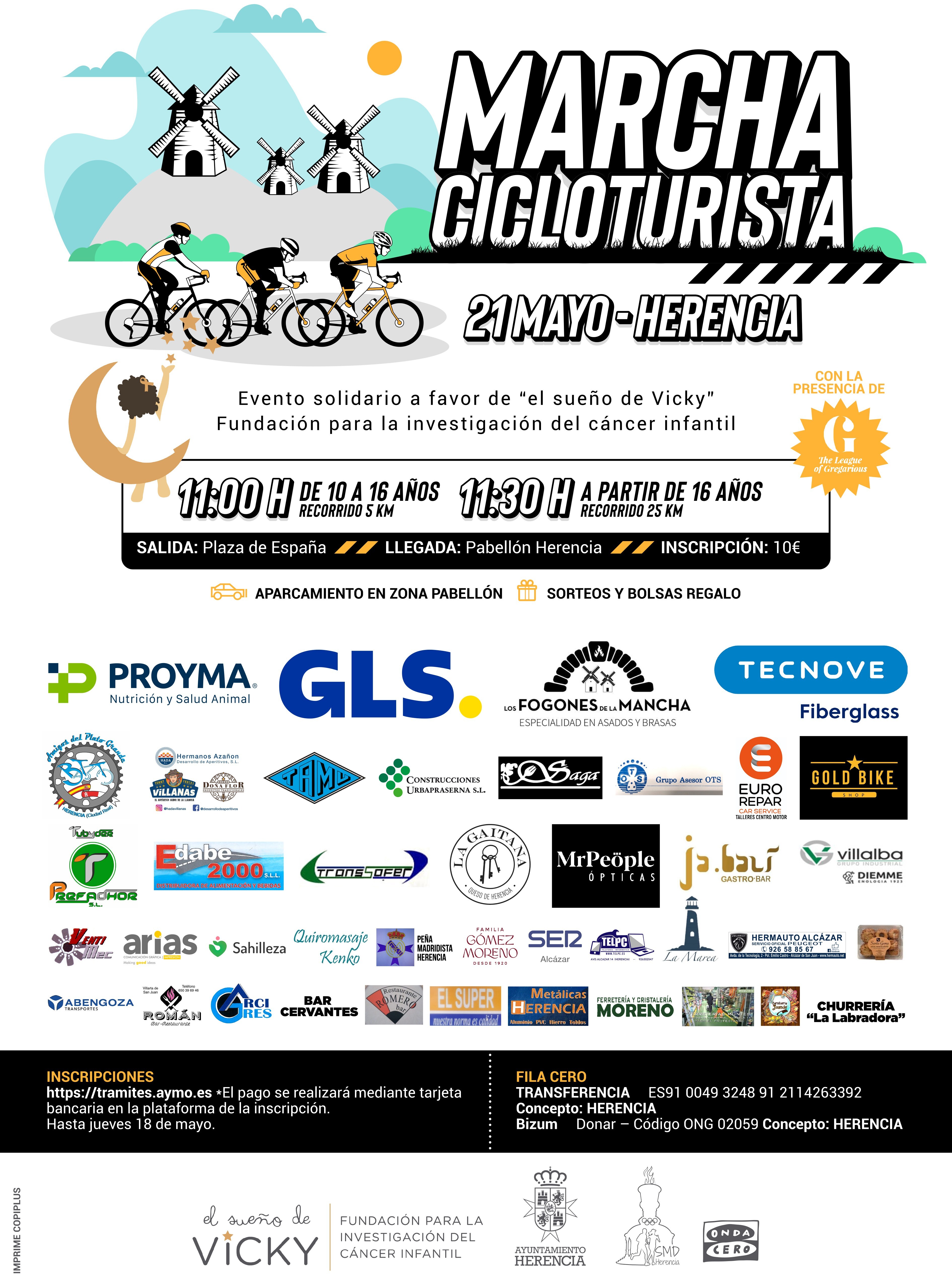 La localidad de Herencia será escenario el domingo 21 de mayo de una Marcha Cicloturista Solidaria a favor de la fundación “El sueño de Vicky”, dedicada a la investigación del cáncer infantil. La prueba está organizada por la Peña Oscar Laguna, con la colaboración del Servicio Municipal de Deportes del Ayuntamiento de Herencia.