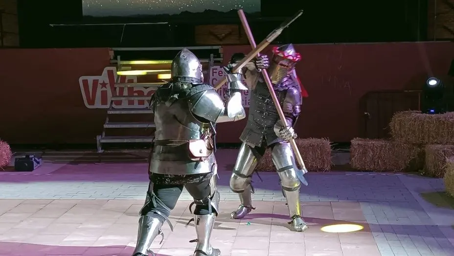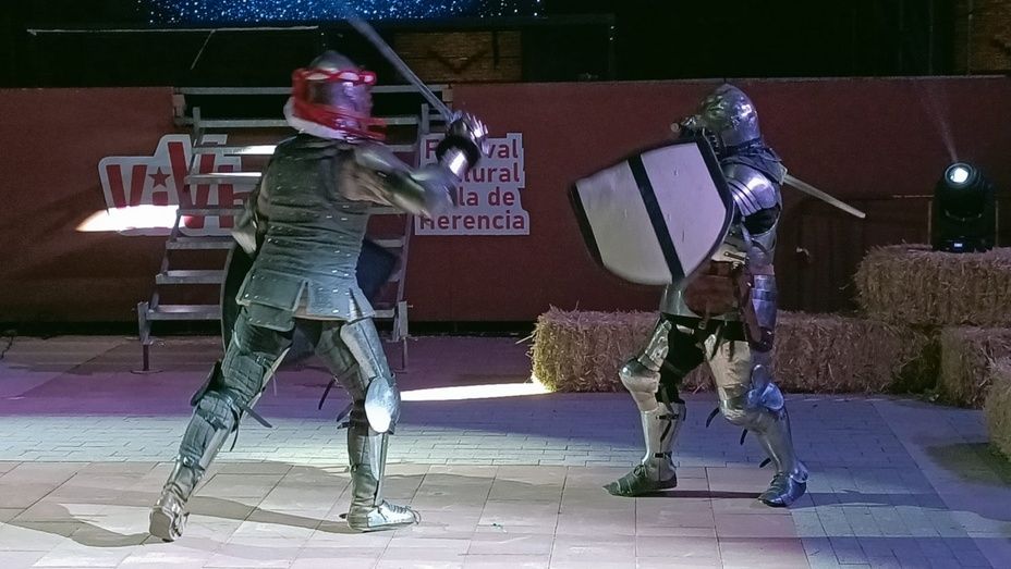 Por último, en la Plaza de España, un intérprete explicó la historia de Herencia durante la Edad Media. Aquí los participantes pudieron disfrutar de un combate de lucha medieval a cargo del equipo de combate medieval “Bohurt La Mancha”. El bohurt es un deporte de contacto, basado en el ejercicio o entrenamiento que hacían nobles y ejército en tiempos de paz para mantenerse activos. Se vieron distintas modalidades de lucha: espada y escudo; mano y media y, por último, arma de asta.