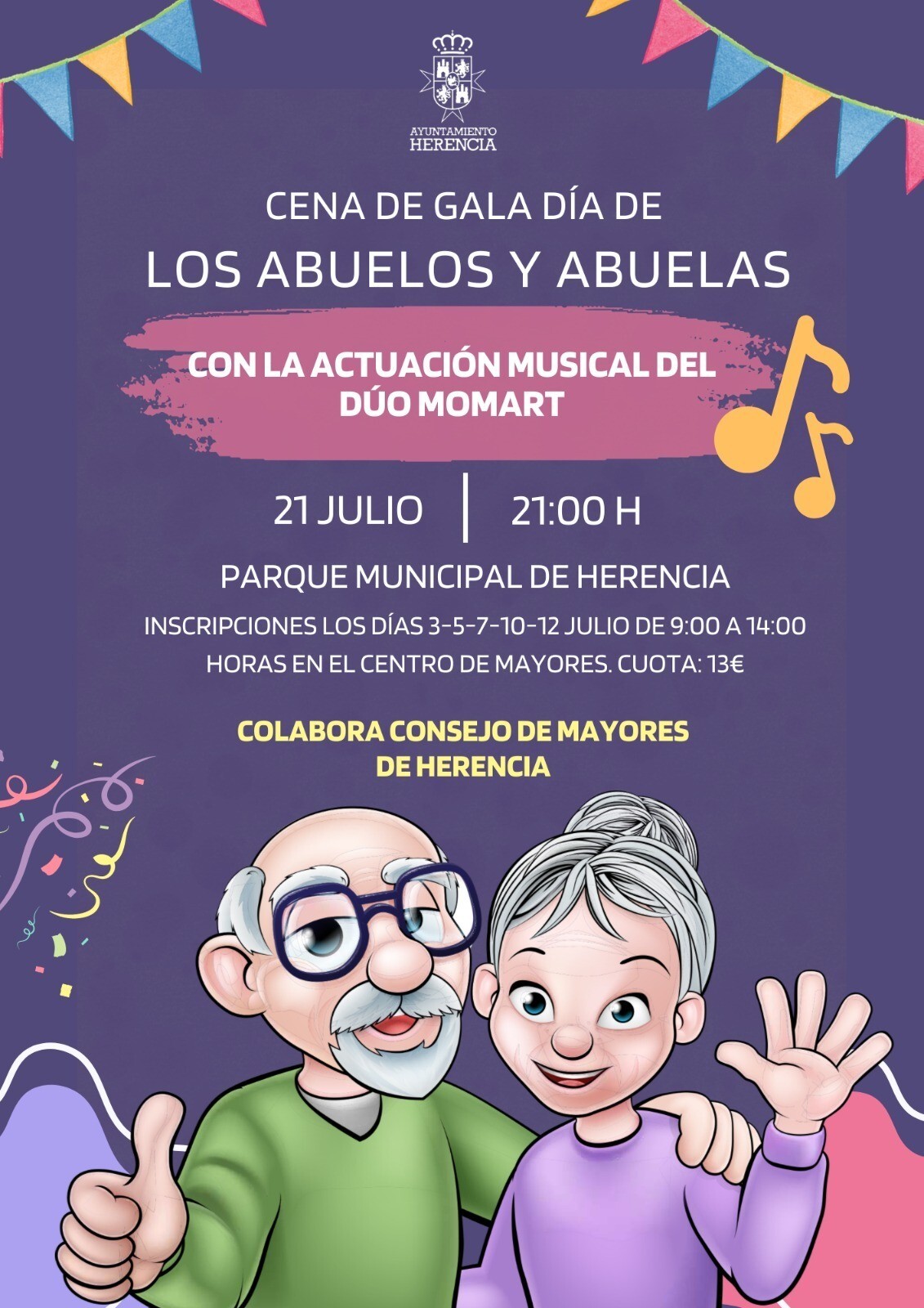 Además de la cena, la velada estará amenizada por el baile y la música del Dúo Momart. El objetivo de esta iniciativa es rendir homenaje a todos los mayores del municipio por todo lo que han ofrecido y ofrecen a la sociedad. Un papel, el de los abuelos, primordial en la actualidad, no solo como fuente de cariño y experiencia hacia los más jóvenes, sino convertidos además en verdaderos héroes arrimando el hombro en el cuidado de los nietos y colaborando para sacar adelante a las familias.