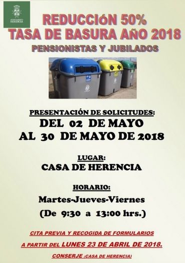 Como ya ocurriera el pasado año, los mayores y pensionistas de Herencia podrán beneficiarse de una reducción del 50 % en la tasa de recogida domiciliaria de basuras y residuos sólidos, lo que supone una ayuda para las economías domésticas.