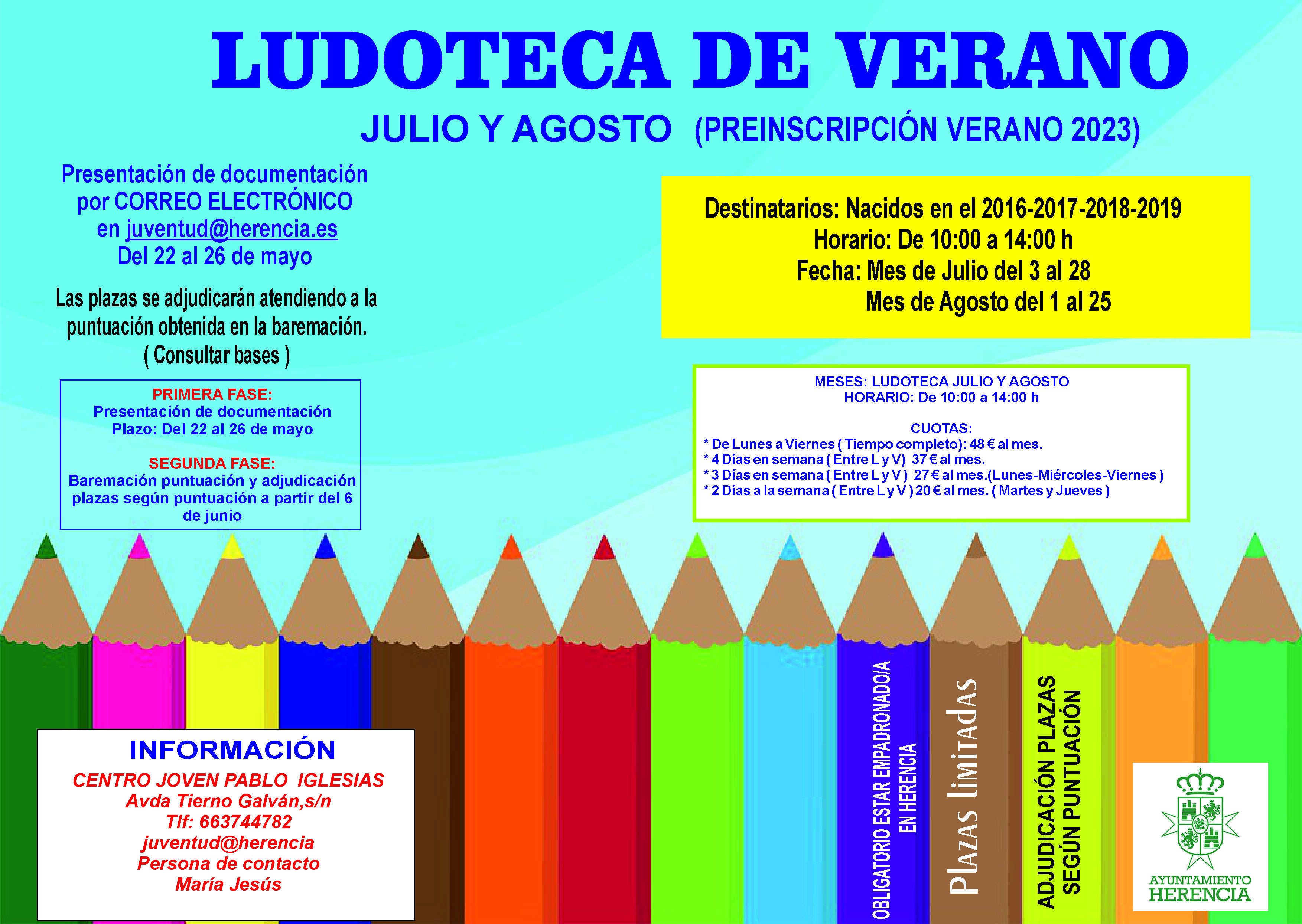 El Ayuntamiento de Herencia ofrece una edición más, el programa de Ludoteca de Verano, destinado a familias con niños y niñas de entre 4 a 7 años, y que durante los meses de julio y agosto, quieran participar en este programa educativo y de gran ayuda para la conciliación laboral. Por este motivo, y debido a su éxito en ediciones anteriores, se va a abrir una tercera clase para dar respuesta a la numerosa demanda.