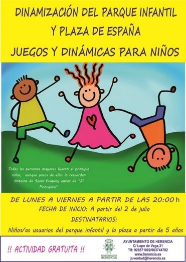 El Ayuntamiento de Herencia presenta, por segundo año consecutivo, el Programa de Dinamización del Parque Infantil, y como novedad para esta edición, también de la Plaza de España. Un proyecto dirigido a niños y niñas a partir de 5 años, para disfrutar del tiempo de ocio en espacios emblemáticos del municipio.