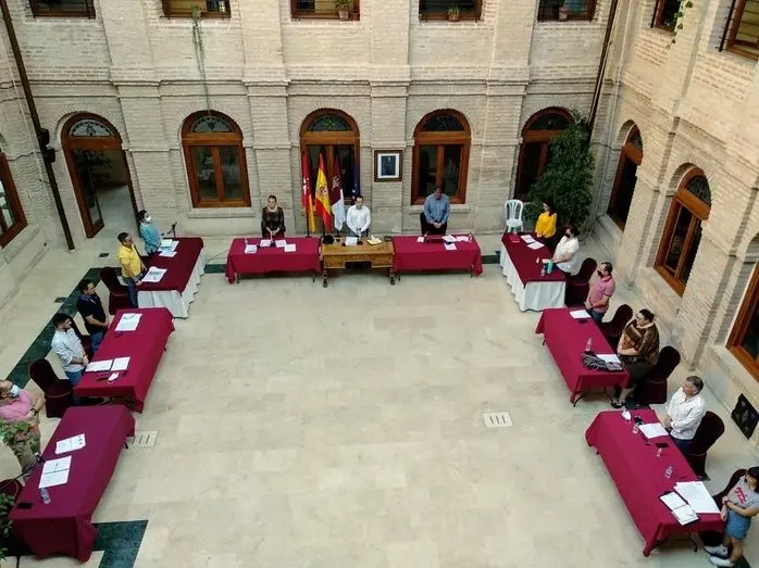 Este jueves, y de forma excepcional, el Patio del Ayuntamiento acogió la celebración del Pleno Ordinario, celebrado ante estrictas medidas de seguridad a causa del Coronavirus. La sesión comenzó con un minuto de silencio por las personas que han fallecido durante el Estado de alarma y en ella se abordaron puntos muy importantes para el desarrollo de la localidad, aprobados por unanimidad, como la modificación del proyecto de urbanización consistente en la solución del pavimento rodado para terminar las calles de la ampliación del Polígono Industrial, o la aprobación de la tasa reguladora para la utilización de las naves del Vivero de Empresas, con precios muy asequibles para el uso de los autónomos.