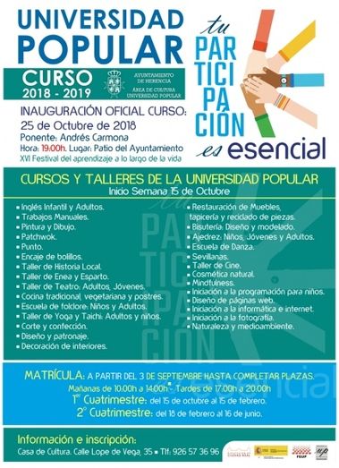 El próximo lunes 3 de septiembre comienzan las inscripciones de una nueva edición de Universidad Popular en Herencia. Con más de 30 años de trayectoria, el área de Educación presenta 28 cursos y talleres, fomentando el aprendizaje y el disfrute del tiempo de ocio de los vecinos del municipio.