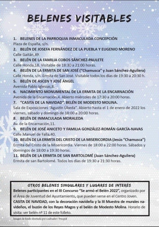 Todos los belenes indicados pueden visitarse libremente, pero hay que tener presente que muchos de ellos se encuentran en casas particulares que abren sus puertas desinteresadamente para que se pueda disfrutar de su arte, lo que implica que en ocasiones no se encuentre nadie en el domicilio y/o no puedan ser visitados a pesar de tener algunos de ellos horarios concretos de visita.