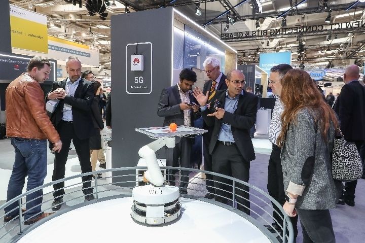 Pie de la foto: El 24 de abril de 2018, en el Hannover Messe de Alemania, los visitantes observan al robot controlado con la tecnología 5G en el área de exhibición de la empresa china Huawei.
