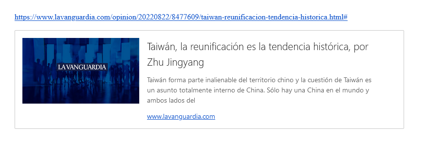 El 22 de agosto, el Cónsul General de China en Barcelona, Sr. Zhu Jingyang, publicó en La Vanguardia “La realización de China de la reunificación nacional es la tendencia histórica”. El texto completo es el siguiente: