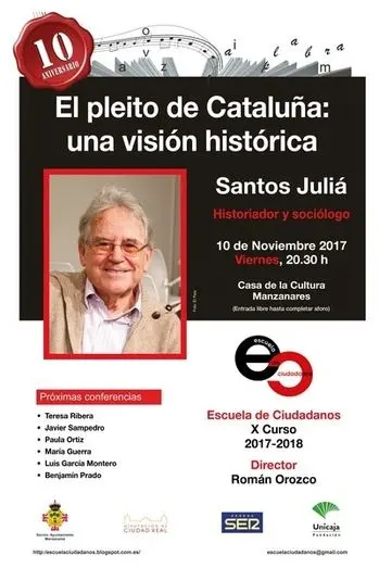 La conferencia de Santos Juliá, sobre un tema que tanto preocupa a los españoles como es el conflicto catalán, tendrá lugar el viernes 10 de noviembre en la Casa de la Cultura de la Universidad Popular de Manzanares (Ciudad Real), a las 20,30 horas, calle Mayorazgo 4. La entrada es libre y gratuita, como todos los actos que organiza la Escuela de Ciudadanos.