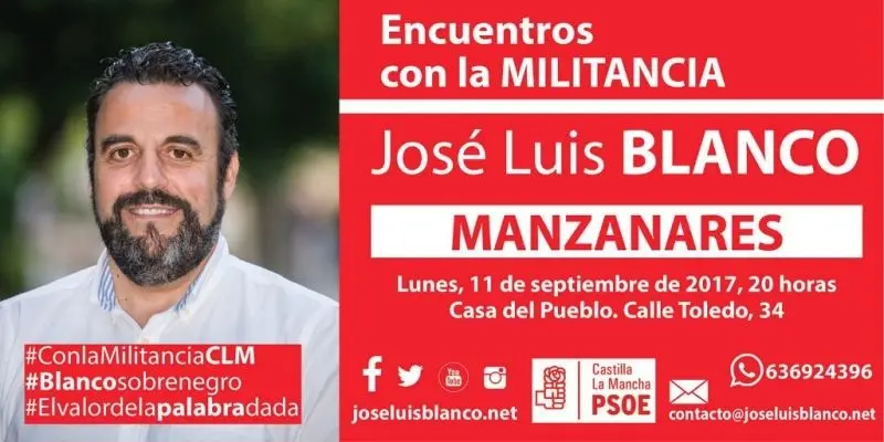 El alcalde de Azuqueca de Henares (Guadalajara), José Luis Blanco, que ha presentado su candidatura para optar a la Secretaría General del PSOE en Castilla-La Mancha, participará este lunes 11 de septiembre, a las 20:00 horas, en un encuentro con militantes en Manzanares. Será en la Casa del Pueblo, C/ Toledo.