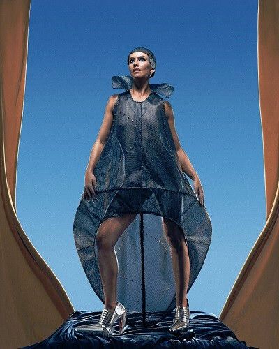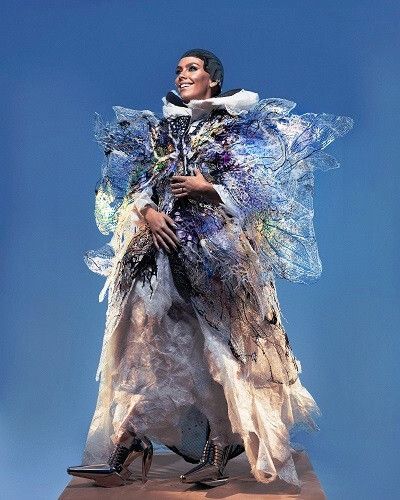 dialogan con la obra del diseñador fallecido. Buj Studio se ha encargado de realizar la capa alada, una pieza que cuenta con más de 580h de trabajo entre diseño y confección, y Manuel Albarran, encargado de realizar los complementos del estilismo (casco, uñas y zapatos). El resultado es un diálogo sobre la metamorfosis y el proceso misterioso de transformación que llevan a cabo muchos insectos y otros seres vivos que buscan al cambiar de piel un nuevo renacer.