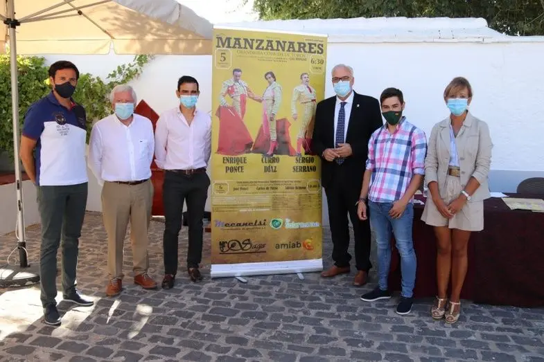 El patio de cuadrillas de la Plaza de Toros de Manzanares ha albergado la íntima presentación de los Festejos Taurinos Manzanares 2020 que, con todas las medidas sanitarias aseguradas, podrán celebrarse el próximo 5 de septiembre, tras la suspensión del festejo en el marco de la Feria y Fiestas de julio. Julián Nieva, Manuel Amador, Manuel Bajo, Santiago Mora y Sergio Serrano han sido los encargados de presentar el cartel que protagonizan el propio Serrano y los toreros Enrique Ponce y Curro Díaz. Los diestros se medirán a los toros de Las Monjas.
