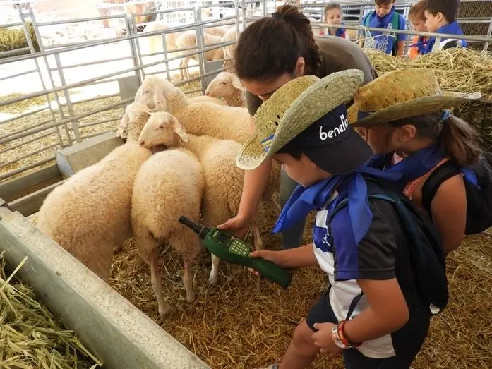 Después de desayunar de manera saludable con los productos manchegos en la Feria Nacional del Campo, los niños y niñas de la Escuela de Verano de la Universidad Popular de Manzanares se acercaron ayer hasta el espacio de la Asociación Nacional de Criadores de Ganado Ovino Selecto de Raza Manchega, Agrama, para conocer las ovejas, y a los sementales que se subastan en la feria.