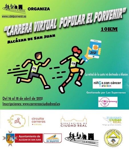El Club Deportivo “El Porvenir” de Alcázar de San Juan ha abierto oficialmente la inscripción para su “Carrera Virtual Popular El Porvenir” 2021, hasta las 23:59 horas del 14 de Abril. La prueba se celebrará desde las 00:00 horas del viernes 16 de Abril hasta las 24 horas del día 18 de Abril, con un recorrido de 10 kilómetros.