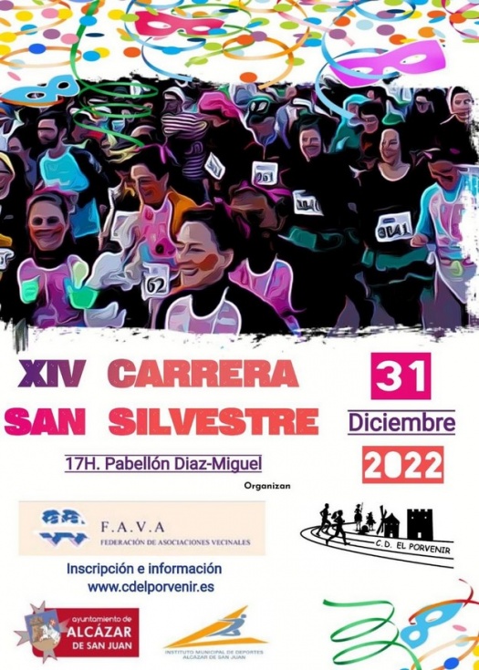 Llega la última clásica del año, la San Silvestre, organizada por la FAVA y el CD El Porverir. Disfrázate y termina el año corriendo y disfrutando, te esperamos. La F.A.V.A. (Federación de Asociaciones de Vecinos de Alcázar de San Juan) y el C.D. El Porvenir, organizan la XIV “San Silvestre”, en colaboración con el Instituto Municipal de Deportes, la concejalía de Deportes del Ayuntamiento de Alcázar de San Juan y los clubes deportivos de la localidad. Tendrá lugar el sábado 31 de diciembre de 2022, a partir de las 17:00 h., en el pabellón Antonio Díaz-Miguel de nuestra localidad.