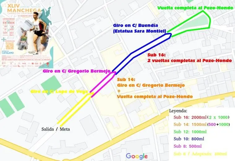 C/ Virgen de Criptana – giro derecha C/ Tercia – giro izquierda Plaza del Posito – giro izquierda C/ Fernández Calzuelas – giro izquierda C/ Pío XII – giro derecha C/ Tercía – giro izquierda C/ Reina Cristina – giro derecha C/ Castillo – giro derecha C/ Convento – giro derecha Plaza Pozo-Hondo– Continúa Avda. Sara Montiel – Meta Avda. Sara Montiel altura piscina climatizada.