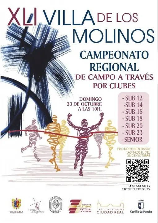 Este próximo domingo 30 de octubre vuelve el Campeonato Regional de Campo a Través 'Villa de los Molinos', que este año celebra su 41ª edición. El Excmo. Ayuntamiento de Campo de Criptana, con la organización del Club de Atletismo Criptana y la colaboración de la Federación Castellano Manchega de Atletismo, la Junta de Comunidades de Castilla La Mancha, la Excma. Diputación Provincial de Ciudad Real, organiza el XLI Trofeo de Cross “Los Molinos” 2022 que será Campeonato regional para las categorías sub12, sub14, sub16, sub18, sub20, sub23 y Senior tanto masculinos como femeninas, a partir de las 10 horas del día 30 de octubre de 2022, en el circuito permanente de Cross de la “Sierra de los Molinos Las categorías de los atletas participantes en Campo a Través, serán: