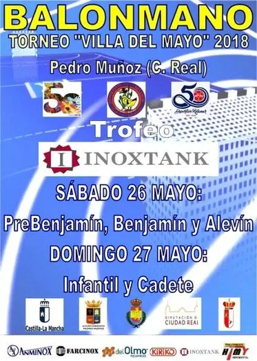 Este fin de semana, la localidad de Pedro Muñoz acoge una nueva edición del torneo "Villa del Mayo", donde se darán cita los diferentes equipos en categorías prebenjamín, benjamín y alevín. Eso será el sábado y ya para el domingo será el turno para las categorías infantil y cadete, un evento donde llegarán a Pedro Muñoz equipos de toda nuestra comarca y provincia y donde sin duda, disfrutaremos de grandes partidos en lo que será, de nuevo, una gran fiesta del balonmano para cerrar así un año dentro de las categorías inferiores. Dicho torneo estará patrocinado por la empresa Inoxtank.
