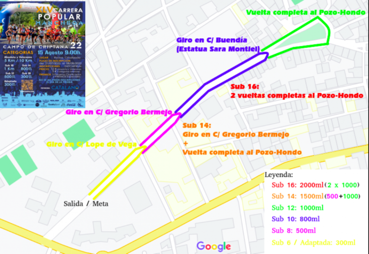 Salida Avda. Sara Montiel altura piscina climatizada - giro izquierda C/Lope de Vega - Giro derecha C/ San Luis - giro derecha C/ Alcázar –Continúa C/ Cardenal Monescillo – giro izquierda Plaza Mayor – giro izquierda C/ Soledad – giro derecha C/ Cristo de Villajos – giro derecha a travesía Cristo de Villajos – Continúa C/ Don Quijote – Continúa C/Alonso Quijano – Continúa C/ Carlos Sander – Continúa C/ Nueva – giro derecha C/ Buenavista – giro derecha C/ Rodadero – giro izquierda C/Huertos – giro derecha C/ Saliente – giro derecha C/ Eras – giro derecha C/ Virgen de Criptana – giro derecha C/ Tercia – giro izquierda Plaza del Posito – giro izquierda C/ Fernández Calzuelas – giro izquierda C/ Pío XII– giro derecha C/ Tercia – giro izquierda C/ Reina Cristina – giro derecha C/ Castillo – giro derecha C/ Convento – giro derecha Plaza Pozo-Hondo – Continúa Avda. Sara Montiel – Meta Avda. Sara Montiel altura piscina climatizada.