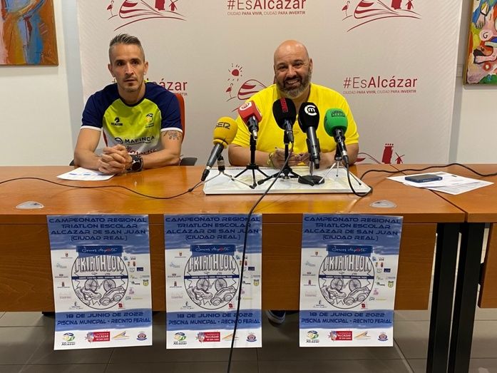 El concejal de Deportes, Javier Ortega, y el presidente del Club Triatlón de Alcázar, Javier Carrillo, han presentado esta mañana el Campeonato Regional de Triatlón escolar que se celebrará en esta localidad el próximo 18 de junio; así como la tradicional prueba de Triatlón que todos los años organiza este Club, que regresa después del parón de pandemia, un día después, es decir el 19 de junio.