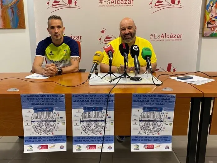 El concejal de Deportes, Javier Ortega, y el presidente del Club Triatlón de Alcázar, Javier Carrillo, han presentado esta mañana el Campeonato Regional de Triatlón escolar que se celebrará en esta localidad el próximo 18 de junio; así como la tradicional prueba de Triatlón que todos los años organiza este Club, que regresa después del parón de pandemia, un día después, es decir el 19 de junio.