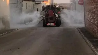 Anoche, media docena de equipos de fumigación recorrieron las calles y parques de Miguel Esteban esparciendo, con atomizadores de más de 1.000 litros cada uno, un desinfectante compuesto por agua y lejía en la proporción recomendada por Sanidad.