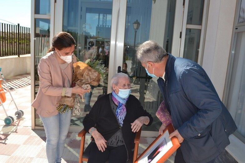 El alcalde, Pedro Casas, junto a la concejal de Servicios Sociales, América Moreno, se trasladaron a la Residencia de Mayores ‘Nuestra Señora del Socorro’ para felicitar personalmente a esta migueleta centenaria y entregarle unos obsequios.