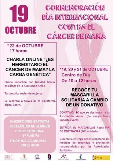 El Centro de la Mujer de Miguel Esteban ha organizado diferentes actividades con motivo de la semana conmemorativa contra el cáncer de mama. Las actividades se desarrollarán del 19 al 23 de octubre.