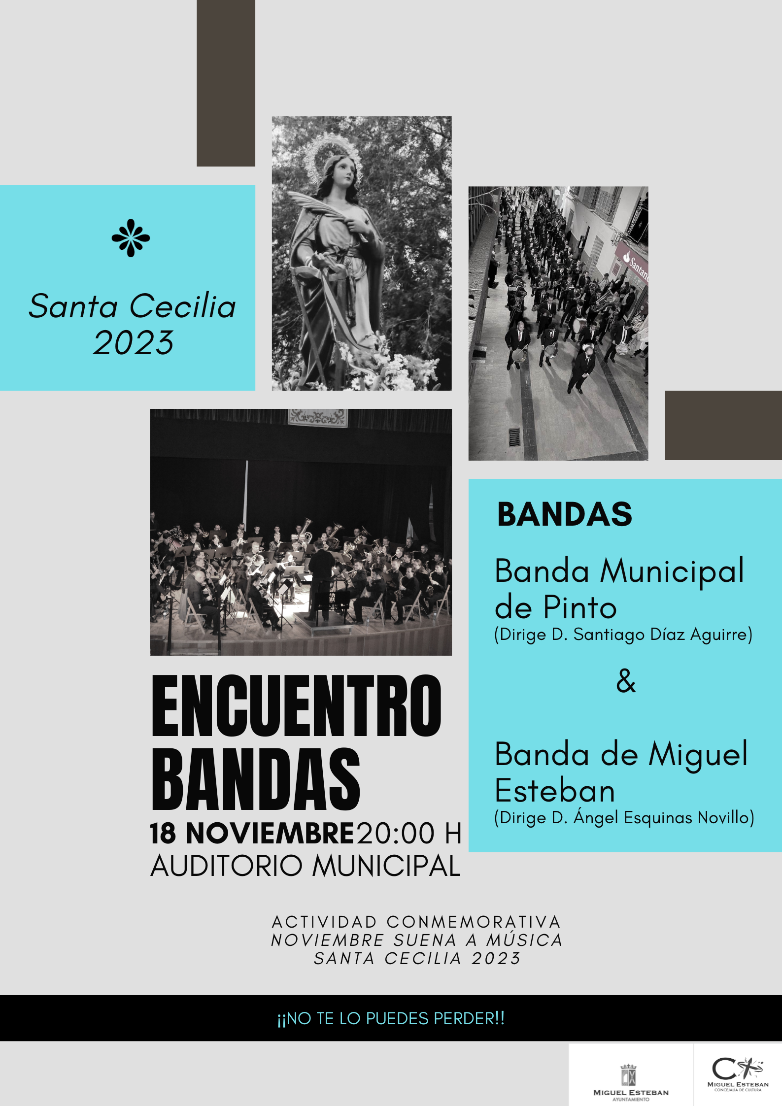 El próximo sábado 18 de noviembre el Auditorio Municipal de Miguel Esteban acogerá el encuentro entre la Banda de Música Asociación Musical Santa Cecilia, de Miguel Esteban y la Banda Municipal de Pinto (Madrid). Este concierto conjunto se ha organizado para celebrar la fiesta en honor a su patrona, Santa Cecilia, que desde hace décadas se celebra de manera puntual en la localidad de Miguel Esteban.