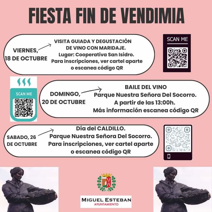 La programación comenzará este viernes, 18 de octubre, con una visita guiada a la Cooperativa San Isidro de Miguel Esteban, que incluye la degustación de vino de la nueva añada y maridaje. La visita, que cuenta con la colaboración de Bodegas Lairén, dará comienzo a las ocho y media de la tarde y las personas interesadas en participar deben formalizar su inscripción en el Ayuntamiento o a través del código QR que encontrarán en los carteles anunciadores. El precio de la inscripción es de 2 euros y parte del dinero recaudado se destinará a la Asociación ‘Las cositas de antaño’.