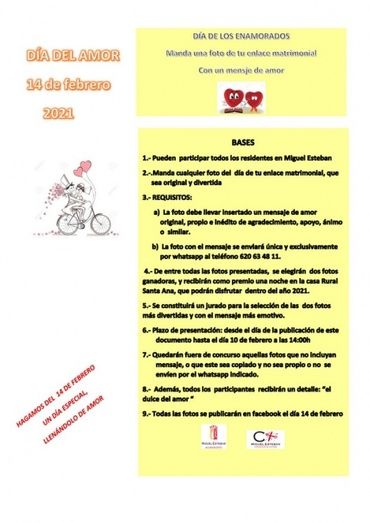 En el concurso de fotografías de San Valentín pueden participar todas las personas residentes en Miguel Esteban. Los participantes deberán enviar una foto de su enlace matrimonial, que sea original y divertida. En ella, deberán insertar un mensaje de amor propio e inédito, de agradecimiento, apoyo, ánimo o similar.