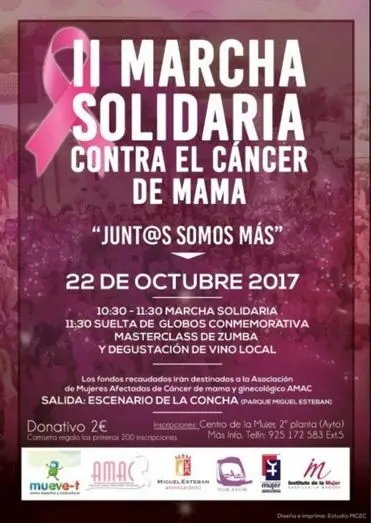 Todas aquellas personas que quieran unirse a esta causa en apoyo a las mujeres afectadas por esta enfermedad pueden apuntarse en el Centro de la Mujer situado en la segunda planta del Ayuntamiento de Miguel Esteban. La inscripción tiene un coste de dos euros que irán destinados íntegramente a la Asociación de Mujeres Afectadas de Cáncer de mama y ginecológico (AMAC). Las 200 primeras personas que se inscriban recibirán una camiseta conmemorativa de regalo.