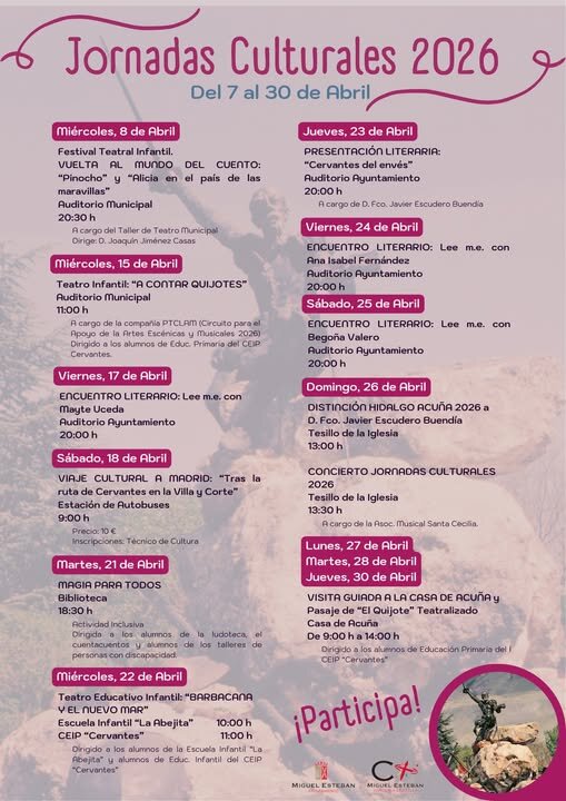 El Ayuntamiento de Miguel Esteban ha presentado la programación de las Jornadas Culturales 2026, que se celebrarán del 7 al 30 de abril, con un completo calendario de actividades culturales, educativas y de ocio dirigidas a todos los públicos.