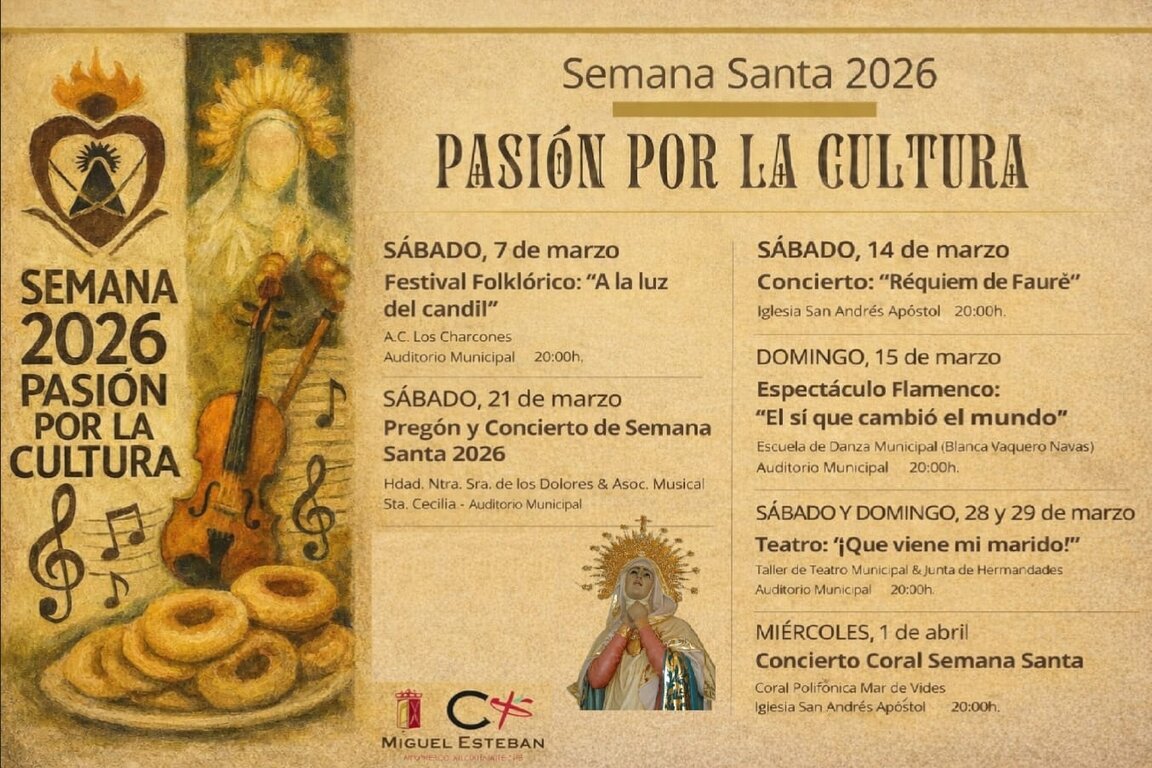 Miguel Esteban volverá a vivir una intensa programación cultural con motivo de la Semana Santa 2026, que este año se desarrollará bajo el lema “Pasión por la Cultura”. Durante el mes de marzo y los primeros días de abril, el municipio acogerá una variada agenda de actividades musicales, escénicas y folclóricas dirigidas a todos los públicos.