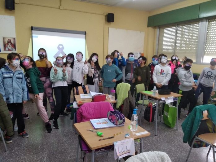 Además de trabajarlos en el aula, los alumnos y alumnas realizaron un mural en el que expusieron las gafas violetas que habían diseñado ellos mismos acompañadas de mensajes, textos e imágenes para mostrar su repulsa hacia este tipo de violencia.