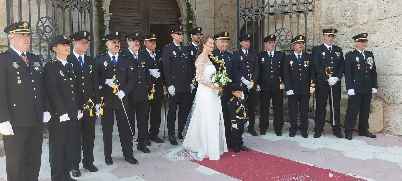 La iglesia parroquial de San Andrés en Miguel Esteban fue ayer testigo de un pasillo de sables realizado por oficiales de la Policía Nacional de Alcázar de San Juan, en la boda de uno de sus compañeros, a quien quisieron homenajear tras la ceremonia con el tradicional arco y choque de sables para desear suerte y alegría a los novios, Antonio y Rocío.