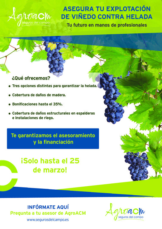 Ya tenemos el tiempo a destiempo, con subidas de temperatura diurna el inicio de la brotación podría adelantarse y luego llegarán las heladas. Por este motivo, desde ACM Seguros se informa al viticultor que si no tiene seguro agrario aún está a tiempo para proteger sus ingresos contra la helada, con un seguro que se puede contratar hasta el 25 de marzo.