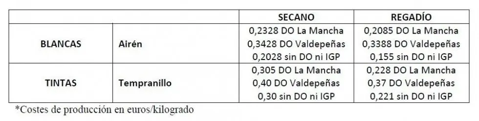 Del estudio que la organización agraria a nivel regional hizo el año pasado, se desprendían los siguientes costes de producción de la uva: