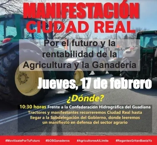 La difícil situación económica y el desprestigio que viene sufriendo el sector agrícola y ganadero regional ha llevado a las tres organizaciones profesionales agrarias y cooperativas agroalimentarias CLM ha convocar una movilización para el próximo 17 de febrero en la capital ciudadrealeña para exigir al gobierno de la nación la puesta en marcha de medidas que permitan paliar la difícil situación por la que atraviesa el sector agrario.