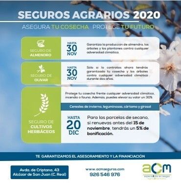 En ACM seguros estamos orgullosos de las garantías que ofrece nuestro sistema español de Seguros Agrarios. Por lo que metidos ya en campaña de contratación de seguros agrarios para la cosecha 2021, animamos a todos los agricultores a que pregunten sobre la forma de suscribir y las opciones que tienen para cubrir todo tipo de adversidad climática, tanto en las Cooperativas Agroalimentarias que colaboran con ACM Seguros como en toda la red técnicos adheridos a ACMseguros.com