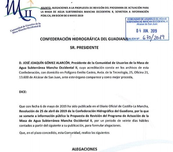 La Comunidad de Usuarios de Aguas Subterráneas (CUAS) de Mancha Occidental II ha presentado las correspondientes alegaciones a la propuesta de revisión del programa de actuación de la Confederación Hidrográfica del Guadiana para esta masa de agua.