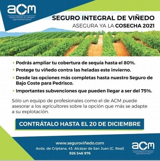 Por lo que desde ACM y Cooperativas Agroalimentarias de Castilla-La Mancha pensamos que la mejora de algunos precios y revisión de rendimientos asegurables, que el viticultor ajustará aún mejor las esperanzas reales de cosecha en su Seguro Integral de Viñedo tanto en calidad como en cantidad.