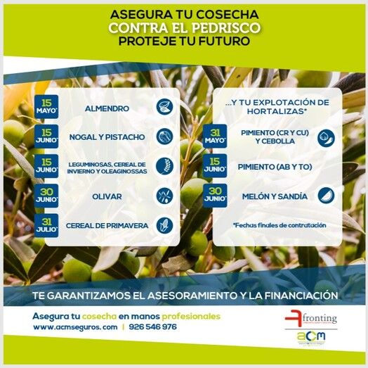 Hasta el 15 de mayo se podrá asegurar contra el pedrisco las producciones de almendro, algarrobo, avellano y la adormidera. Y hasta el 31 de mayo se puede contratar aún el seguro de cebolla ciclo 1, pimiento en Ciudad Real y Cuenca, tomate para fresco en Ciudad Real, Cuenca y Toledo y para industria solo en Toledo.