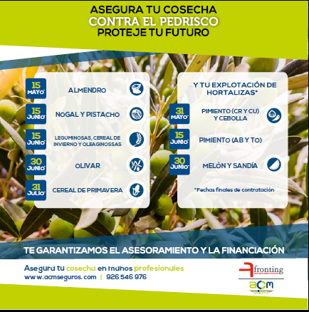 Desde ACM Correduría de Seguros y nuestra organización, Cooperativas Agroalimentarias de Castilla-La Mancha, nos comprometemos con la difusión del Plan Anual de Seguros Agrarios, insertando publicidad en nuestra revista de Cooperativas Agroalimentarias de Castilla-la Mancha, diseñando y emitiendo cuñas de radio, y distribuyendo guías impresas del Seguro Agrario y carteles del plan anual 2021.
