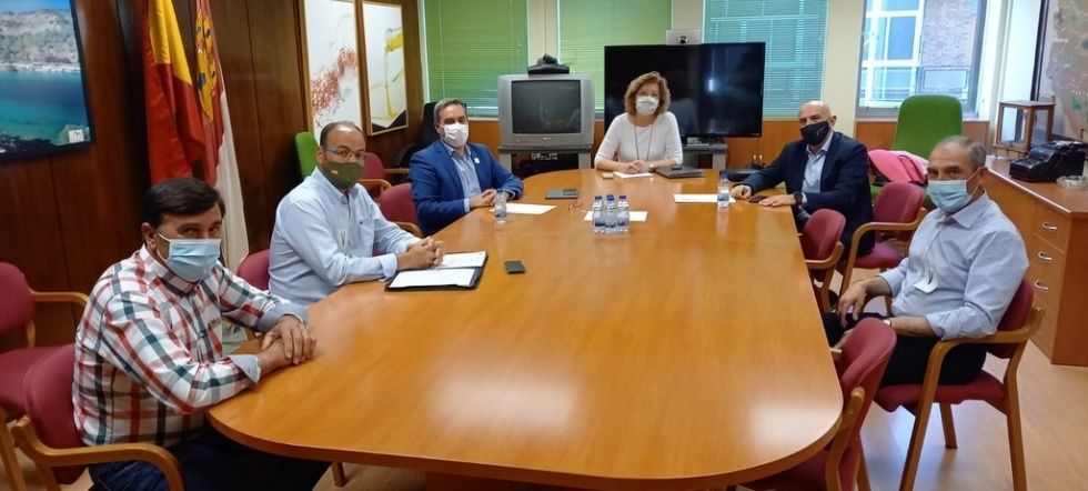 El presidente de la Confederación Hidrográfica del Guadiana (CHG), Samuel Moraleda; el director general de Desarrollo Rural de la Consejería de Agricultura, Agua y Desarrollo Rural de Castilla-La Mancha, José Juan Fernández, junto a la delegada de Agricultura de la Junta de Comunidades en Ciudad Real, Amparo Bremard, y los representantes de la Asociación de Afectados por la No Legalización de Pozos de Explotaciones Prioritarias y Agricultores a Título Principal (ATP) Miguel Fernández, Francisco Zarco y Abel Alcolea se han reunido en la delegación de Agricultura en Ciudad Real para abordar la problemática de los pozos de regadío de las explotaciones prioritarias.