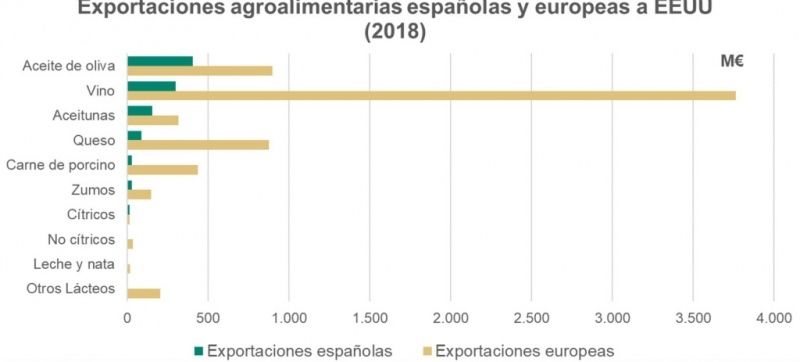 A nivel de exportación, de entre estos grupos, España destaca por las exportaciones de aceite de oliva (405 Mill.€), vino (300 Mill.€), aceituna de mesa (155 Mill.€) y queso (87 Mill.€). Por su parte, los cítricos tienen un peso muy notable dentro de las exportaciones a EEUU, suponiendo más del 95% de las exportaciones europeas de este producto. Por lo tanto, España sería uno de los países más perjudicados por el conflicto.