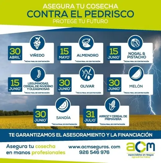 Por lo que recomendamos a todo aquel productor vitícola que no haya asegurado aún, que no se lo piense más, y que contacte rápidamente o bien el lunes 30 de abril o el miércoles día 2 de mayo con cualquiera de los colaboradores de ACM o consulte en www.acmseguros.com